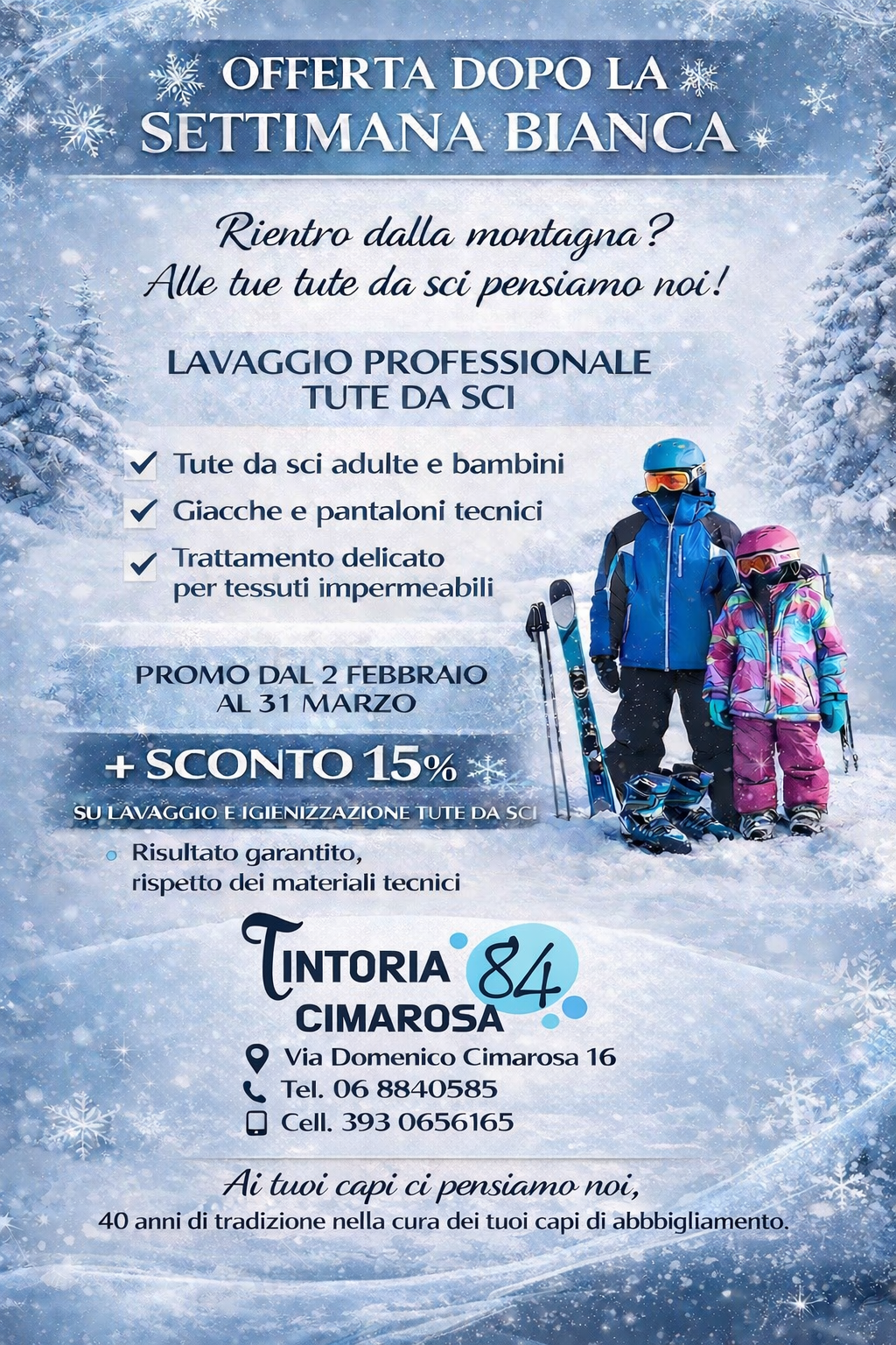Per la tua settimana bianca la Tintoria Cimarosa offre un servizio per preservare la qualità, comfort e performance, garantendo protezione e durata nel tempo delle tute da sci e dei capi tecnici. L'offerta che abbiamo pensato per te è valida fino al 31 Marzo.